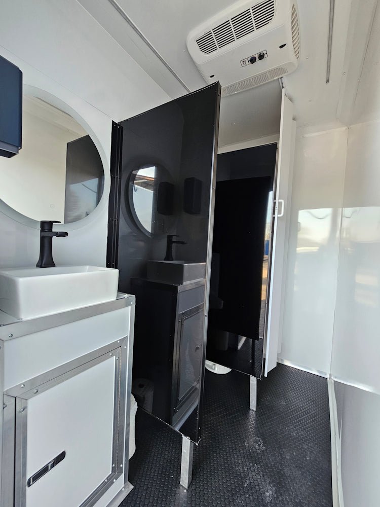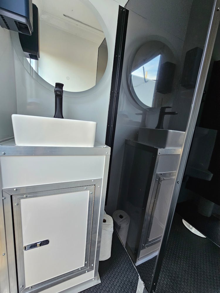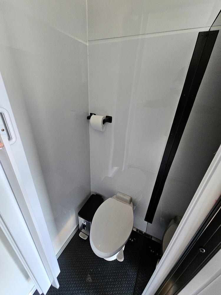 - Sophisticated Interiors: White aluminum walls with contrasting black aluminum stall dividers add a stylish touch.
