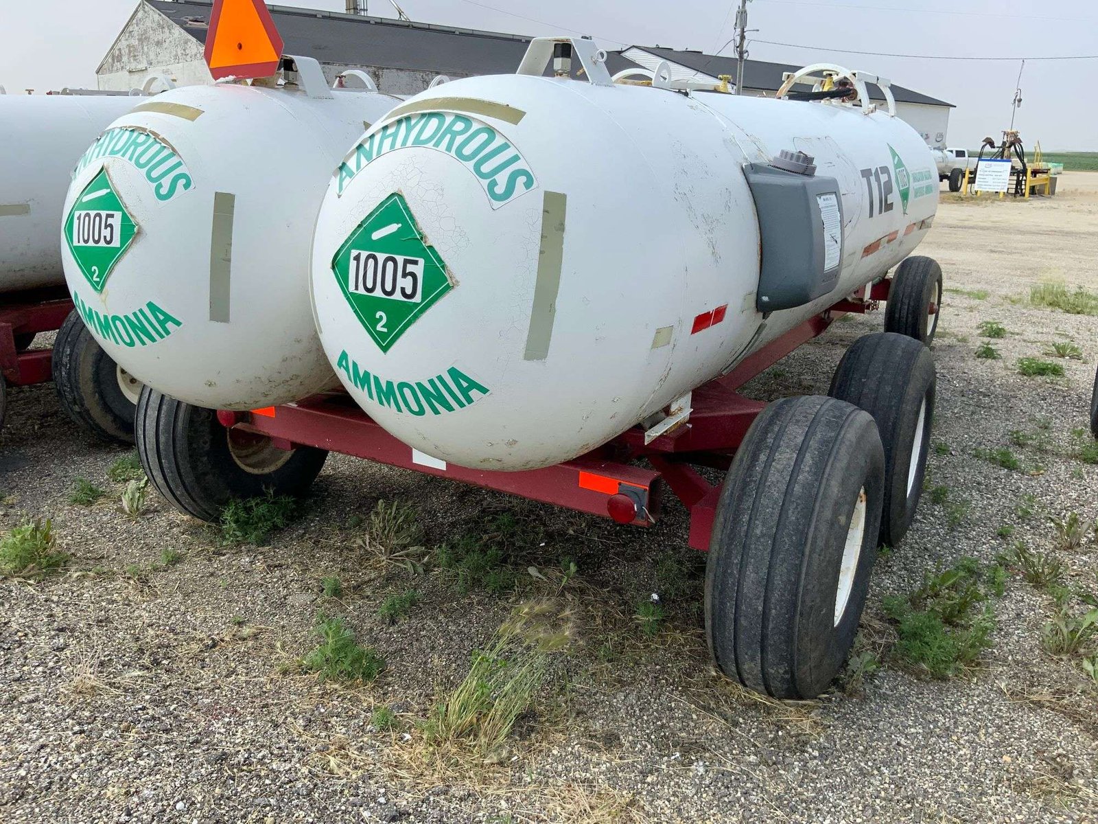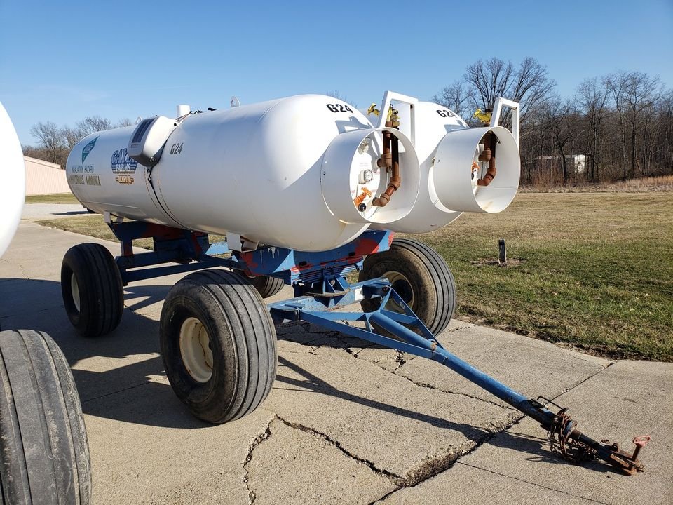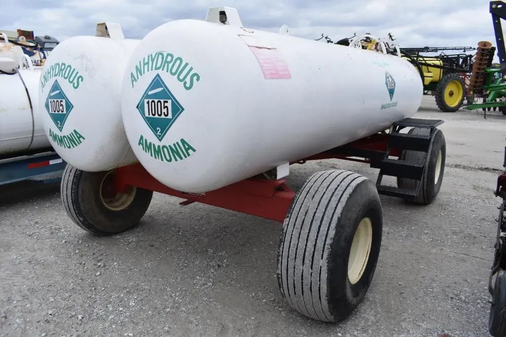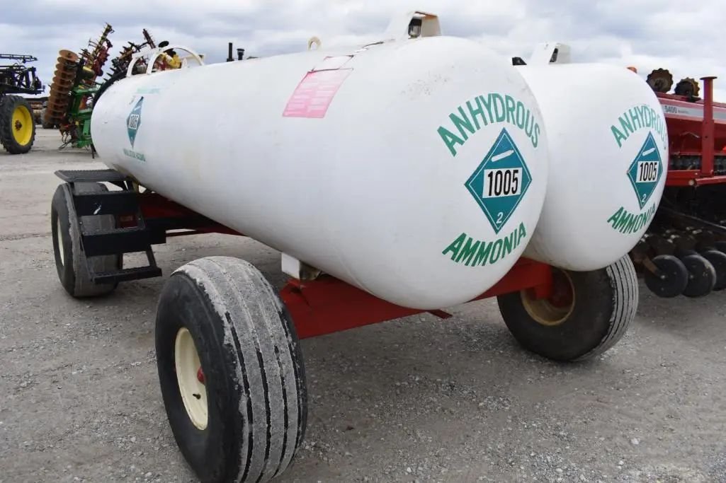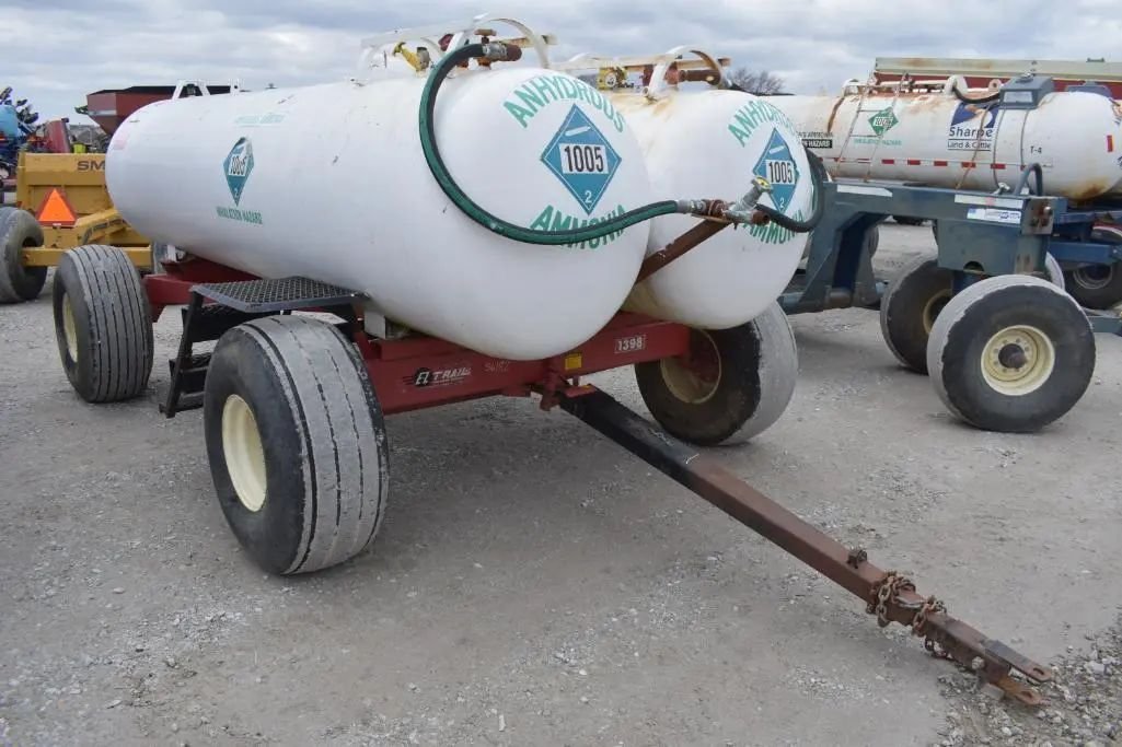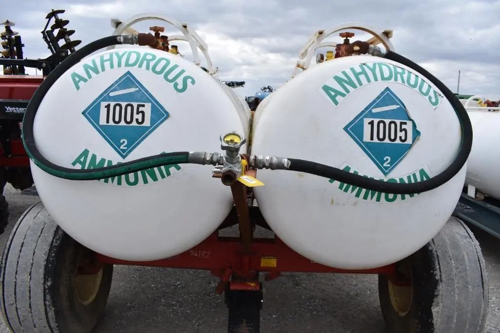 Dual 1000 Gallon Anhydrous Tanks Mounted On 120″ Row Crop Center Running Gear, Tanks Are Trinity Brand, Top Draw, Tank Length 193 1/2″, 250PSI@125 Degrees Fahrenheit, Total Width Approx. 134″, Rinse Tank, Gauges, And Valves Intact, Rear Hitch, Cat Walk, 1 Spare Tire Included (Not Pictured), Tires: 15.00-16 Goodyear Aircraft Rib, Note: RF Tire Has Thin Spot In Middle.