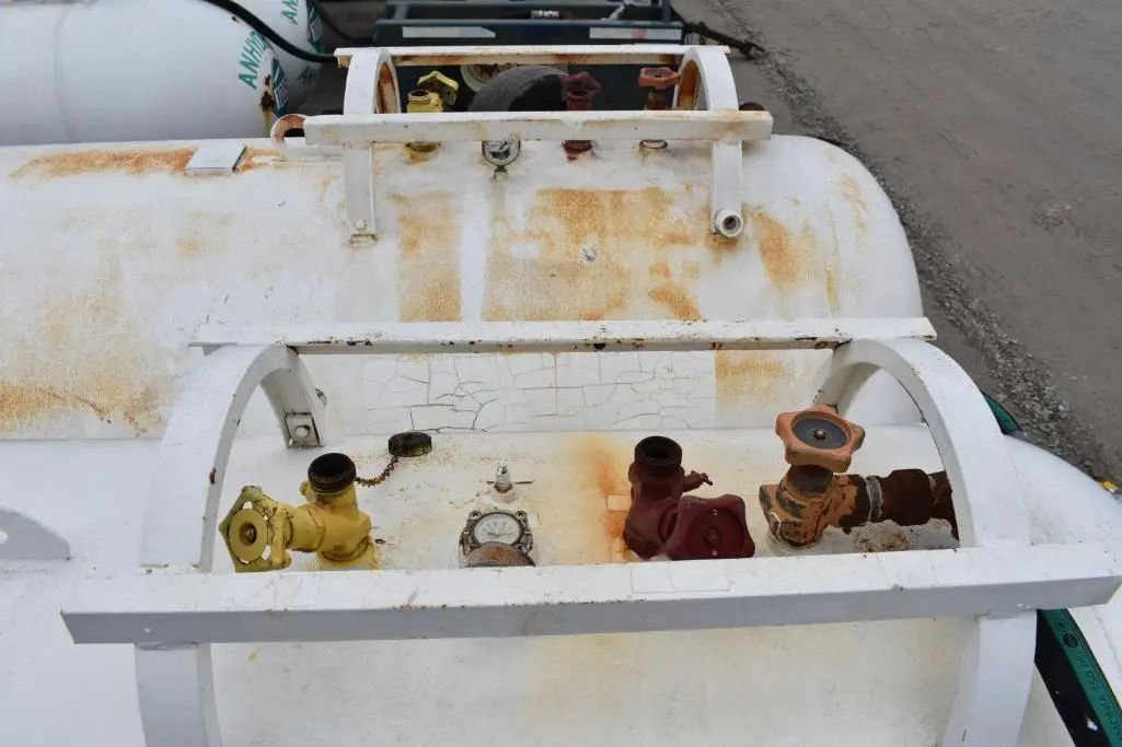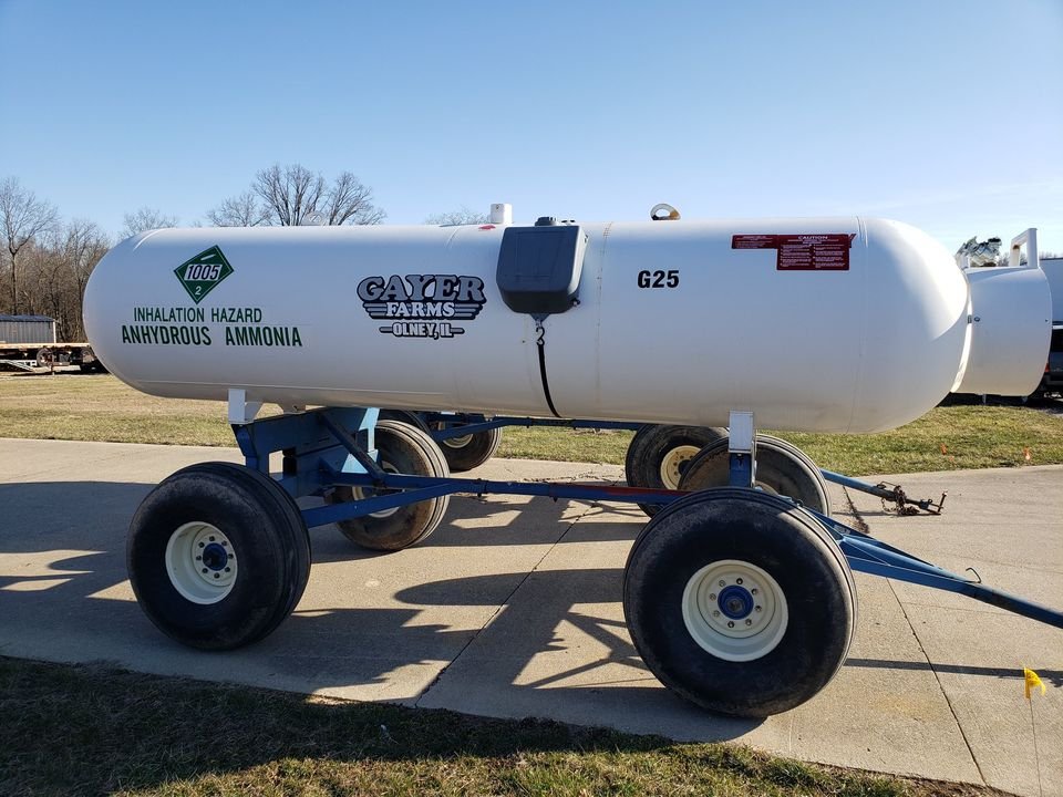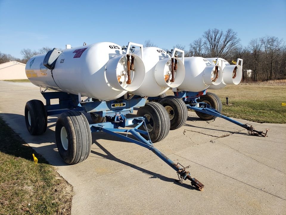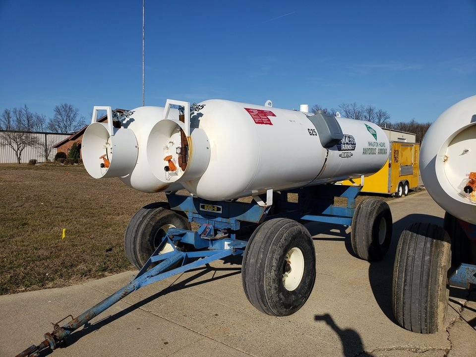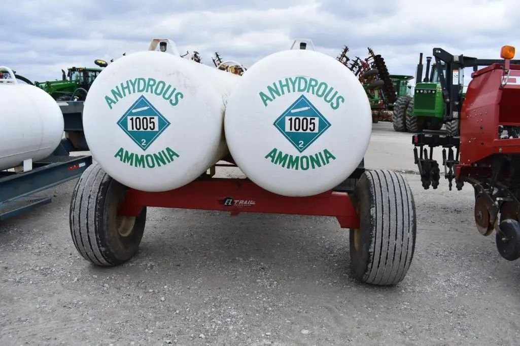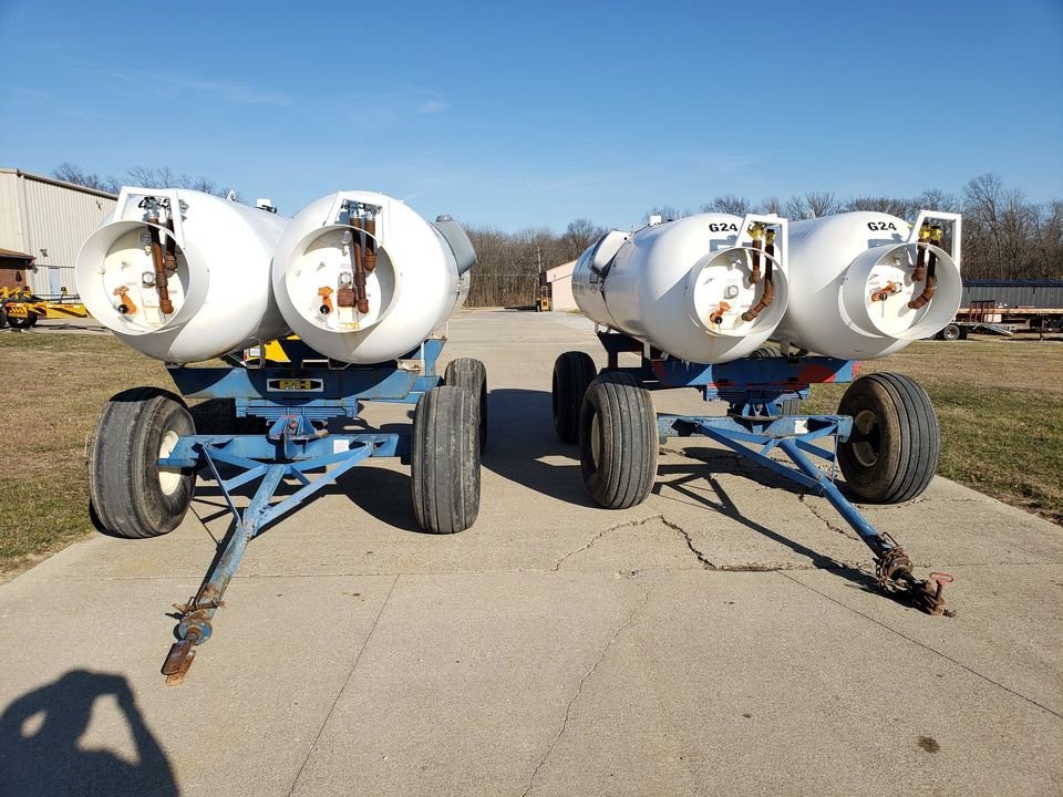 Dual 1000 Gallon Anhydrous Tanks Mounted On 120″ Row Crop Center Running Gear, Tanks Are Trinity Brand, Top Draw, Tank Length 193 1/2″, 250PSI@125 Degrees Fahrenheit, Total Width Approx. 134″, Rinse Tank, Gauges, And Valves Intact, Rear Hitch, Cat Walk, 1 Spare Tire Included (Not Pictured), Tires: 15.00-16 Goodyear Aircraft Rib, Note: RF Tire Has Thin Spot In Middle.