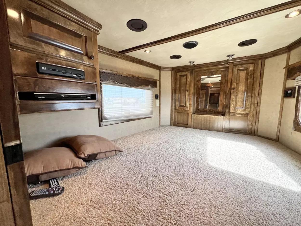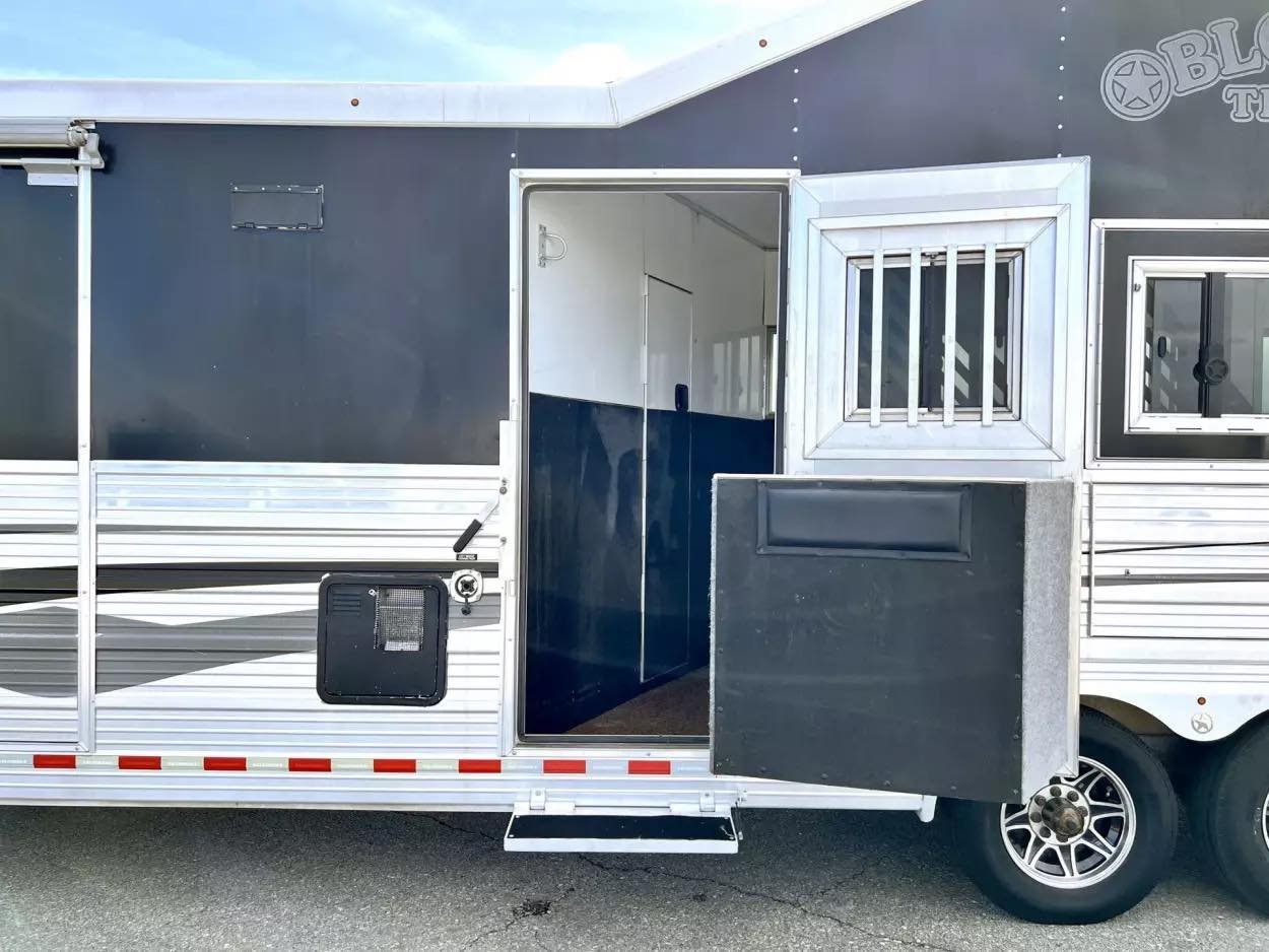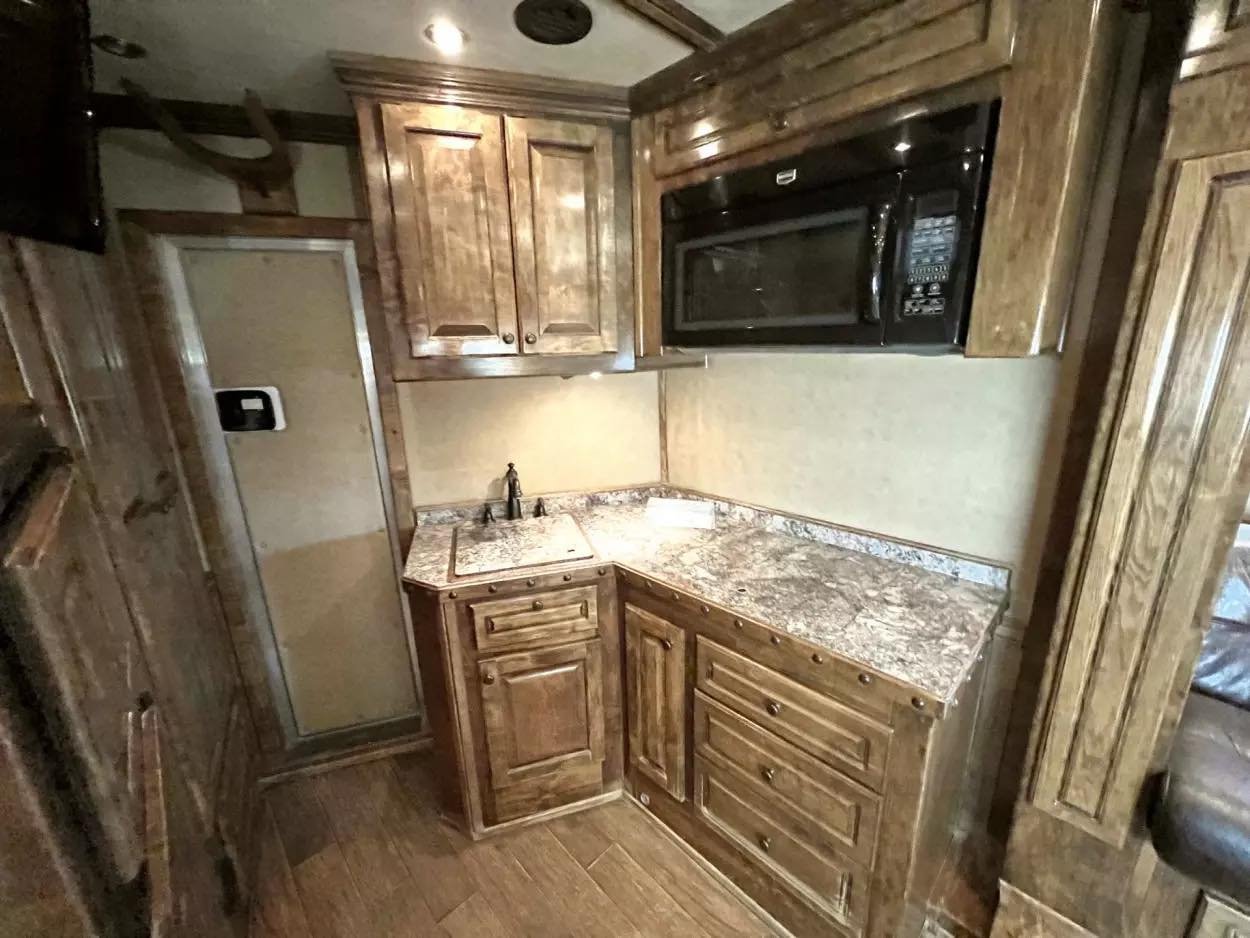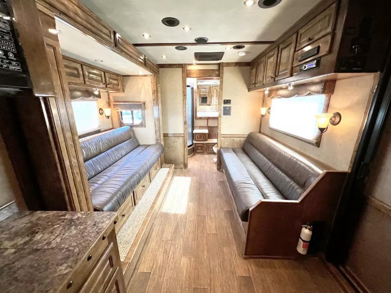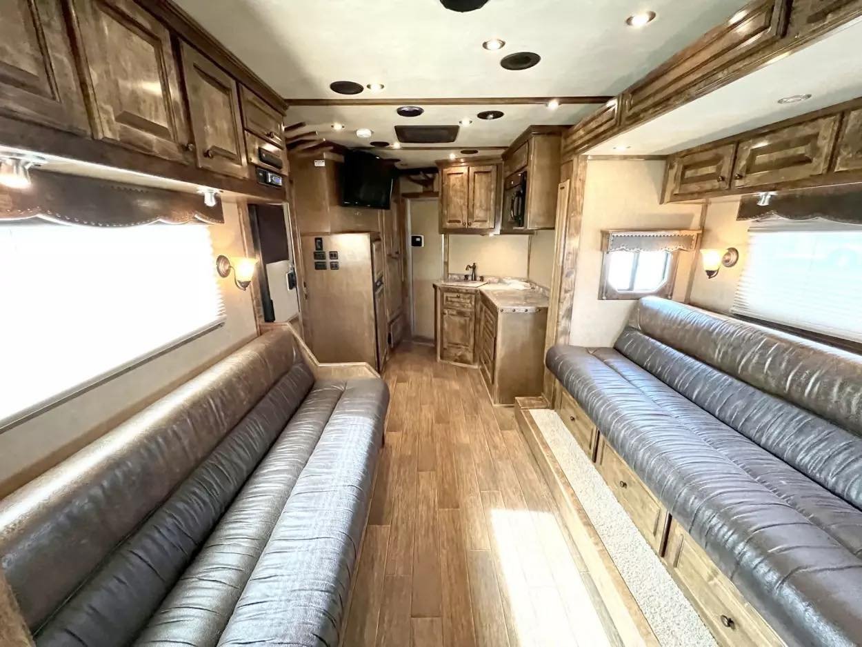 Trailer Features: 32′ floor, 8′ tall, 8′ wide, 16′ LQ by Trail Boss Conversions, Air ride 10k axles with disc brakes, New WERM floor, Integrated Pod, 60 gallon water tanks in pod with auto watering system in the stalls, water misting system in the stalls, 17.5″ Alcoa wheels, 18 ply Continental tires, Lined and insulated, 7′ hydraulic slide, Mangers under every horse, Drops front & back with swing style feed doors, Closed front, Fixed back tack, Stud divider & more. LQ Features: 16′ Trail Boss Conversion, 5500W Gen, Electric awning, Hardwood floors, German Beechwood cabinets, Deco ceilings, Custom headboard, Privacy wall in GN, Tile back splashes, Raised foot cabinets, Micro-convection oven, Recessed cooktop, Central vac system, Cedar lined closets, Copper sinks, Genuine leather 80″ sofa, Upgraded slide room trim, Ducted floor heat, 10 gallon water heater, Flip up counter top extension, Upgraded Sony sound system, Push bottom porcelain toilet, Enormous wardrobe closet with 2nd entry door in bath.