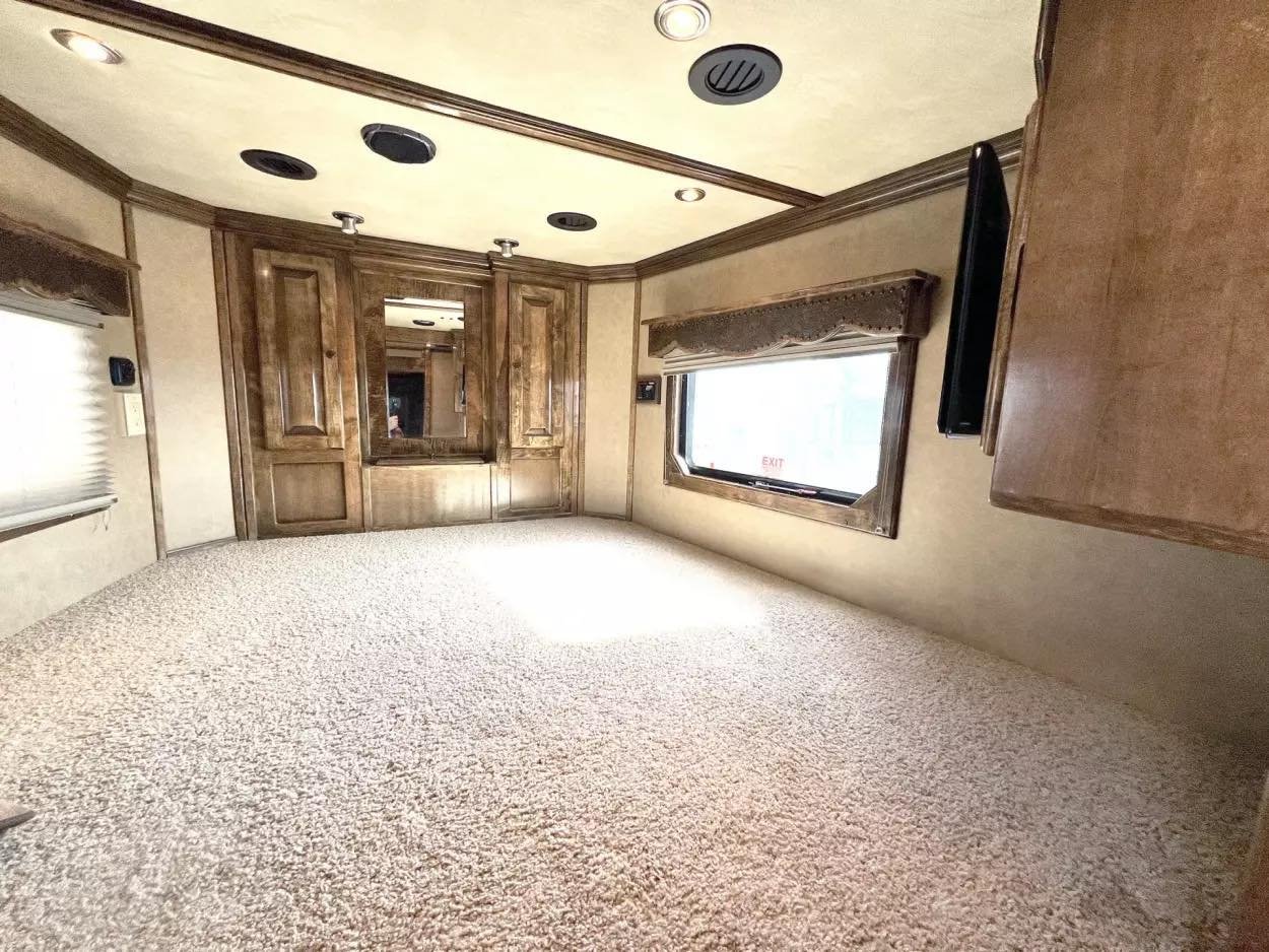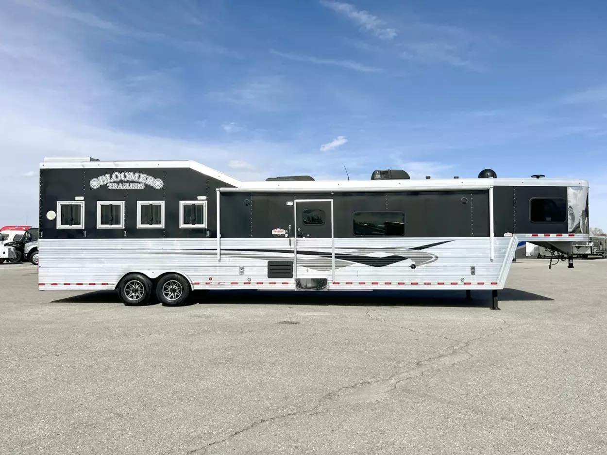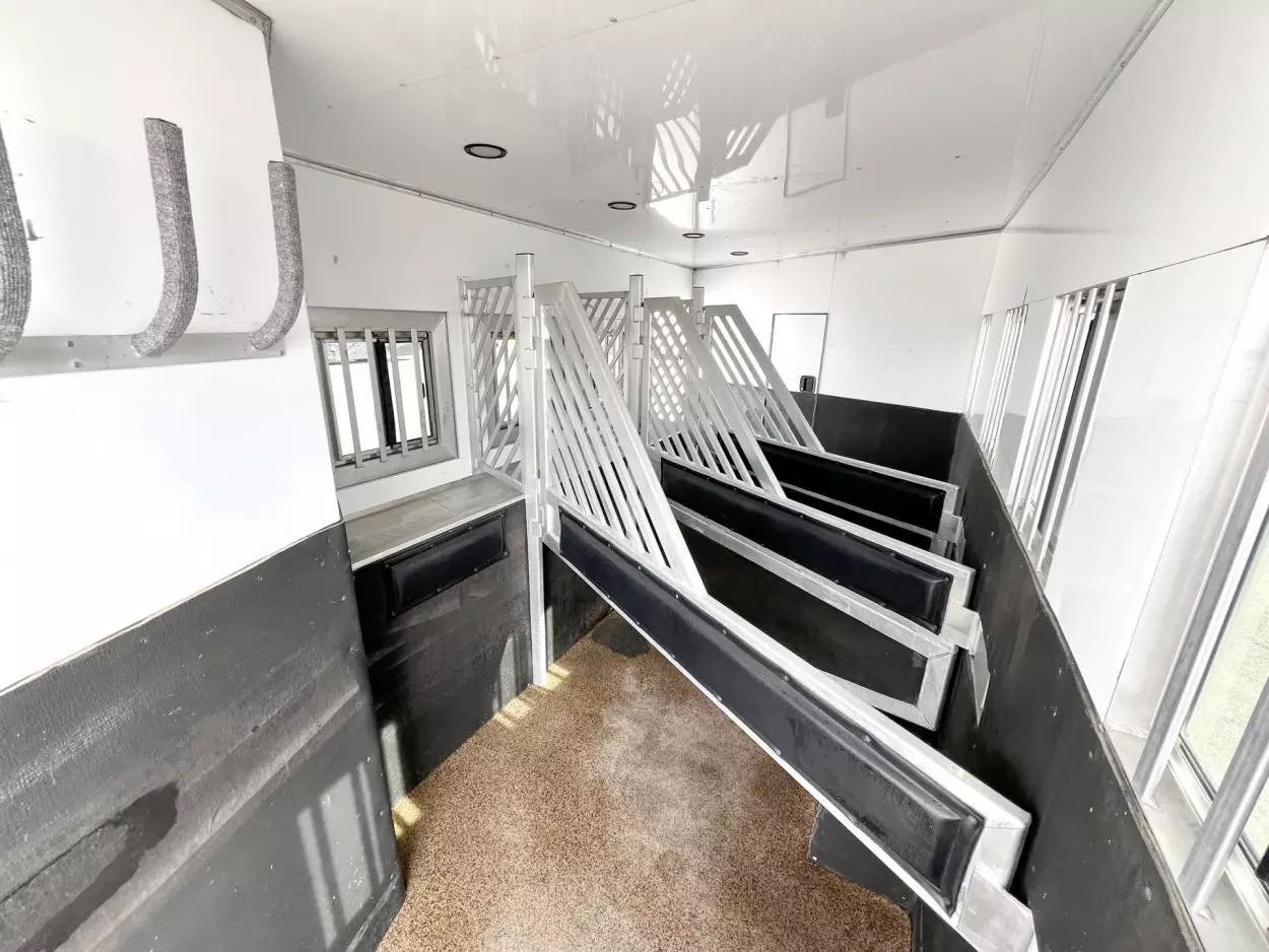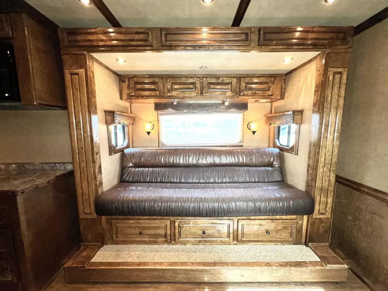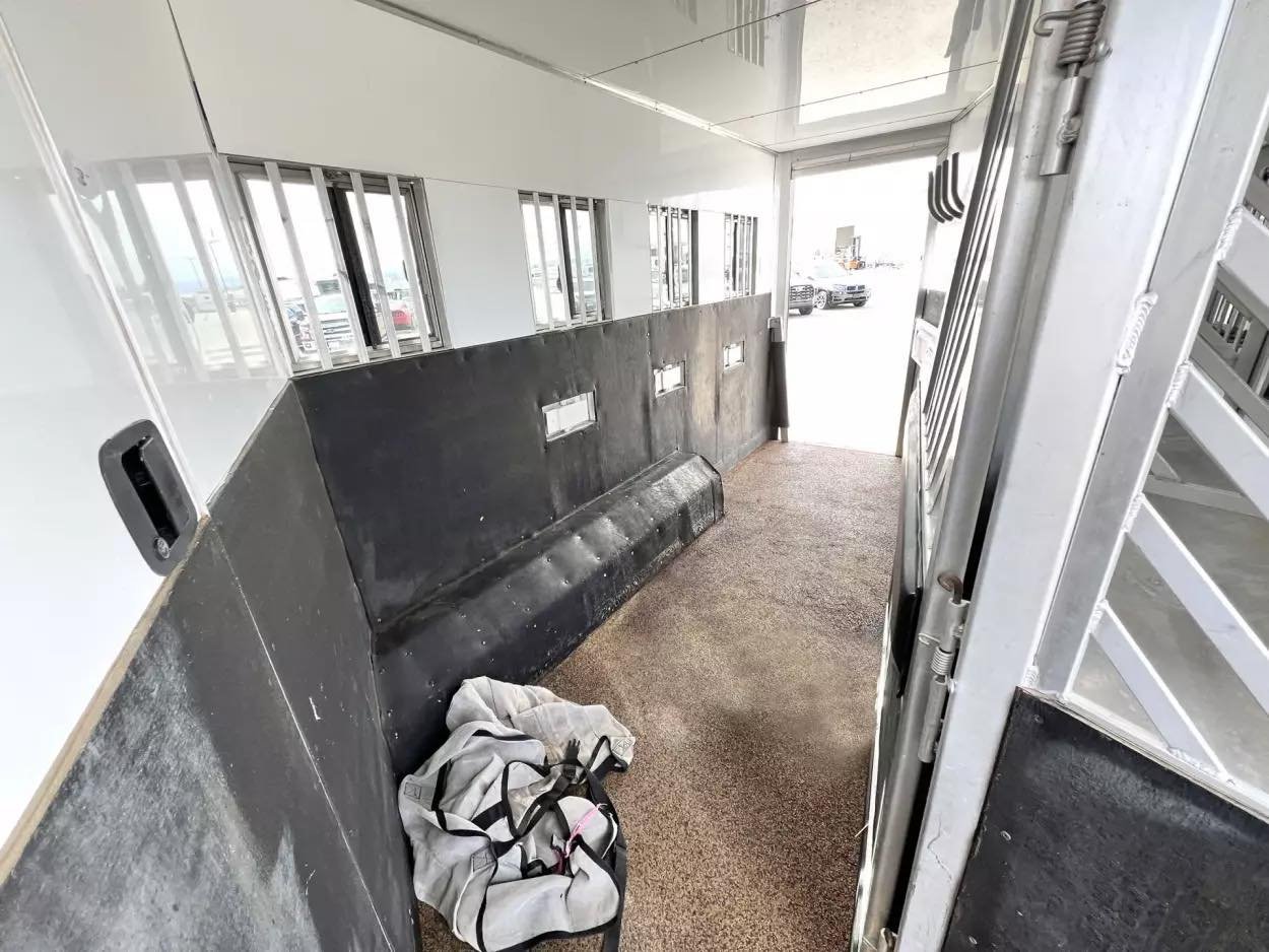 Trailer Features: 32′ floor, 8′ tall, 8′ wide, 16′ LQ by Trail Boss Conversions, Air ride 10k axles with disc brakes, New WERM floor, Integrated Pod, 60 gallon water tanks in pod with auto watering system in the stalls, water misting system in the stalls, 17.5″ Alcoa wheels, 18 ply Continental tires, Lined and insulated, 7′ hydraulic slide, Mangers under every horse, Drops front & back with swing style feed doors, Closed front, Fixed back tack, Stud divider & more. LQ Features: 16′ Trail Boss Conversion, 5500W Gen, Electric awning, Hardwood floors, German Beechwood cabinets, Deco ceilings, Custom headboard, Privacy wall in GN, Tile back splashes, Raised foot cabinets, Micro-convection oven, Recessed cooktop, Central vac system, Cedar lined closets, Copper sinks, Genuine leather 80″ sofa, Upgraded slide room trim, Ducted floor heat, 10 gallon water heater, Flip up counter top extension, Upgraded Sony sound system, Push bottom porcelain toilet, Enormous wardrobe closet with 2nd entry door in bath.